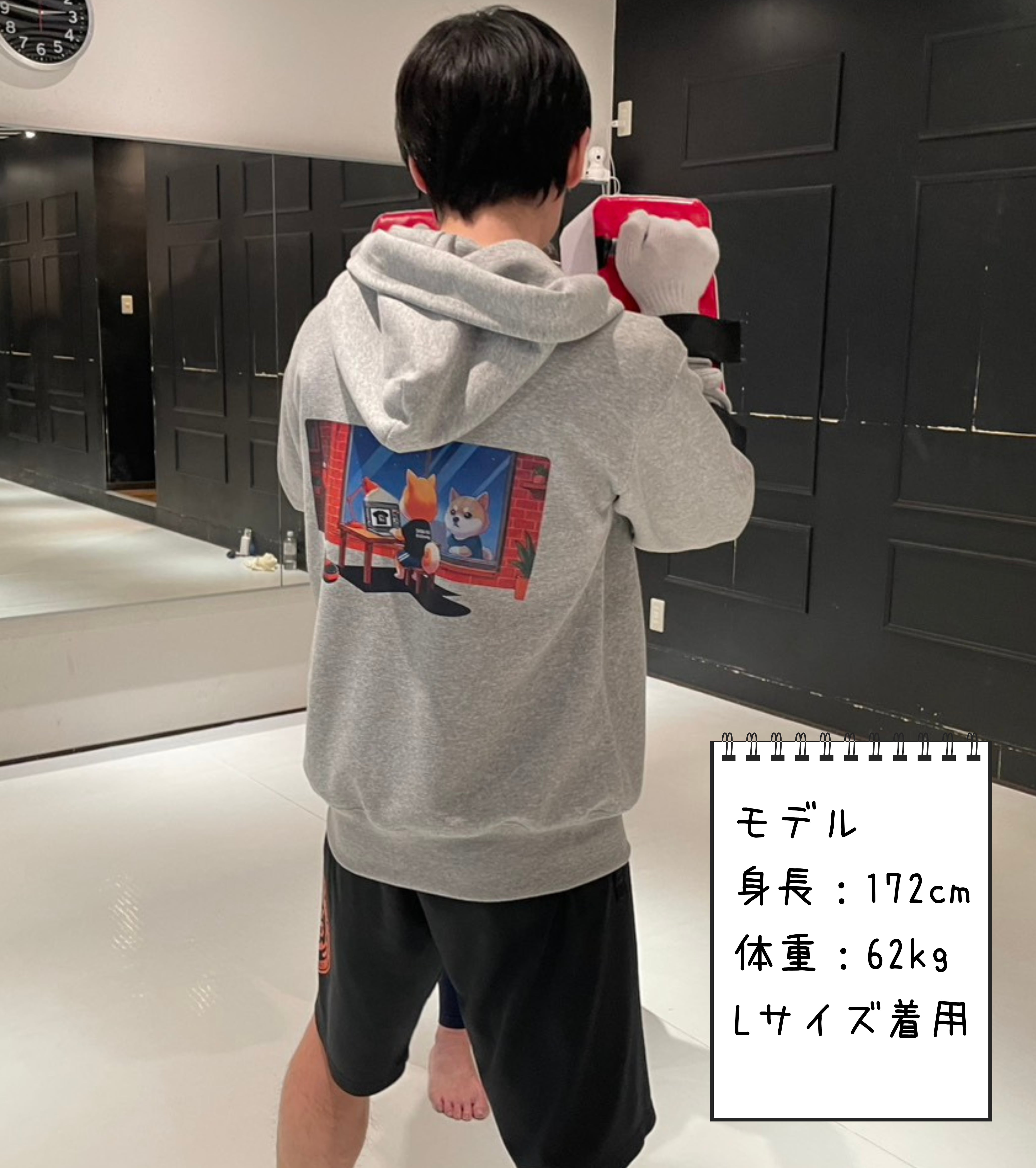 Back: 夜のジムで作業する柴犬トレーナーの、エモくて可愛いバックプリント。